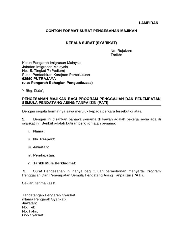 Surat sokongan kerja ataupun juga dikenali sebagai surat pengesahan . Pengguna perlu memuat naik imbasan surat pengesahan yang telah ditandatangani oleh penyelia. Ketua pengarah imigresen malaysia jabatan . Surat pengesahan majikan pemohon · get link · facebook · twitter · pinterest · email · other apps . Surat pengesahan majikan in english. Bujang majikan · affirmation letter of the single .